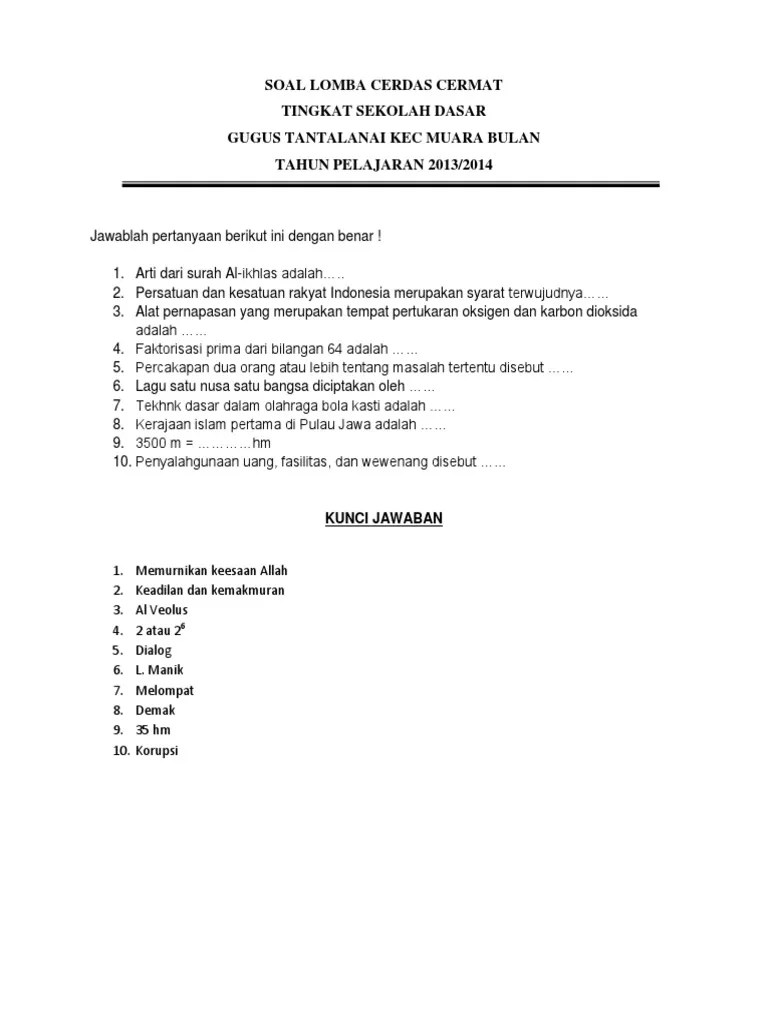 Karena hampir setiap tahun di sekolah atau di kampung kampung ada lomba cca antar sekolah atau antar jamaah. 1 dan 2 7 perhatikan gambar berikut. soal dan kunci jawaban lomba cerdas cermat lcc tingkat sd pilihan ganda. dan iuran jpk sebesar rp 500 000 yang dipotong dari total gaji sebesar rp 20 000 000 untuk bulan ini. Pada bagian kelima berisikan materi soal sejarah tentang berpikir sejarah seperti.